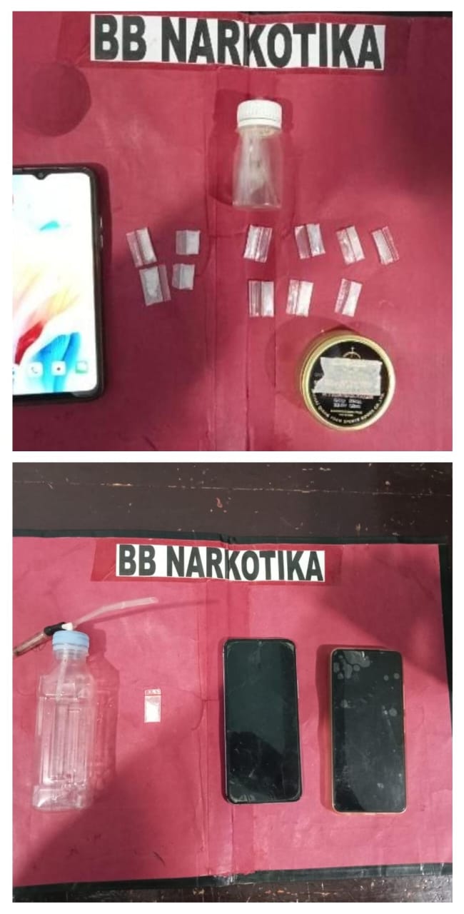 Selain ketiga tersangka, petugas kepolisian juga turut mengamankan berbagai barang bukti, antara lain : 5 bungkus plastic klip bening yang beriskan Kristal –klristal putih diduga keras Narkotika Golongan I jenis sabu, 7 bungkus plastic klip bening yang beriskan Kristal –klristal putih diduga keras Narkotika Golongan I jenis sabu, 3 Unit HP Android, 1 tisu, 1 helai celana pendek, 2 buah alat hisap sabu (bong), 1 buah kaleng bekas peluru senapan angin.