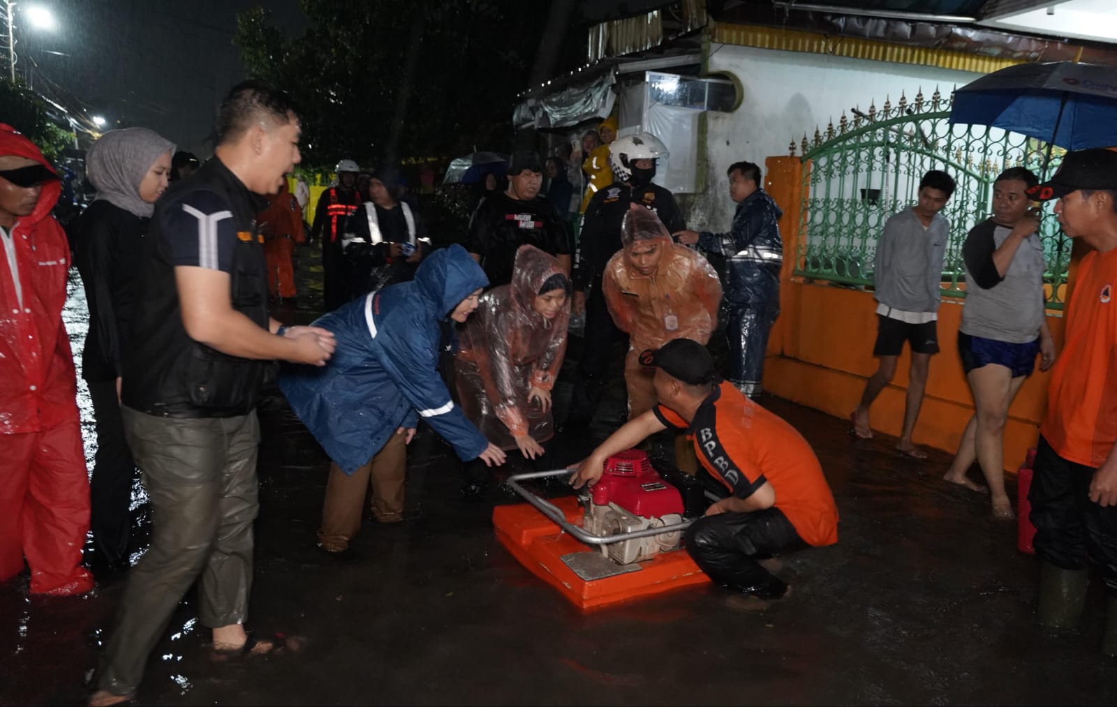 BPBD pun diturunkan untuk mengeruk sendimen yang ada di gorong-gorong serta alat sedot air, sehingga bisa mengalir lebih cepat.